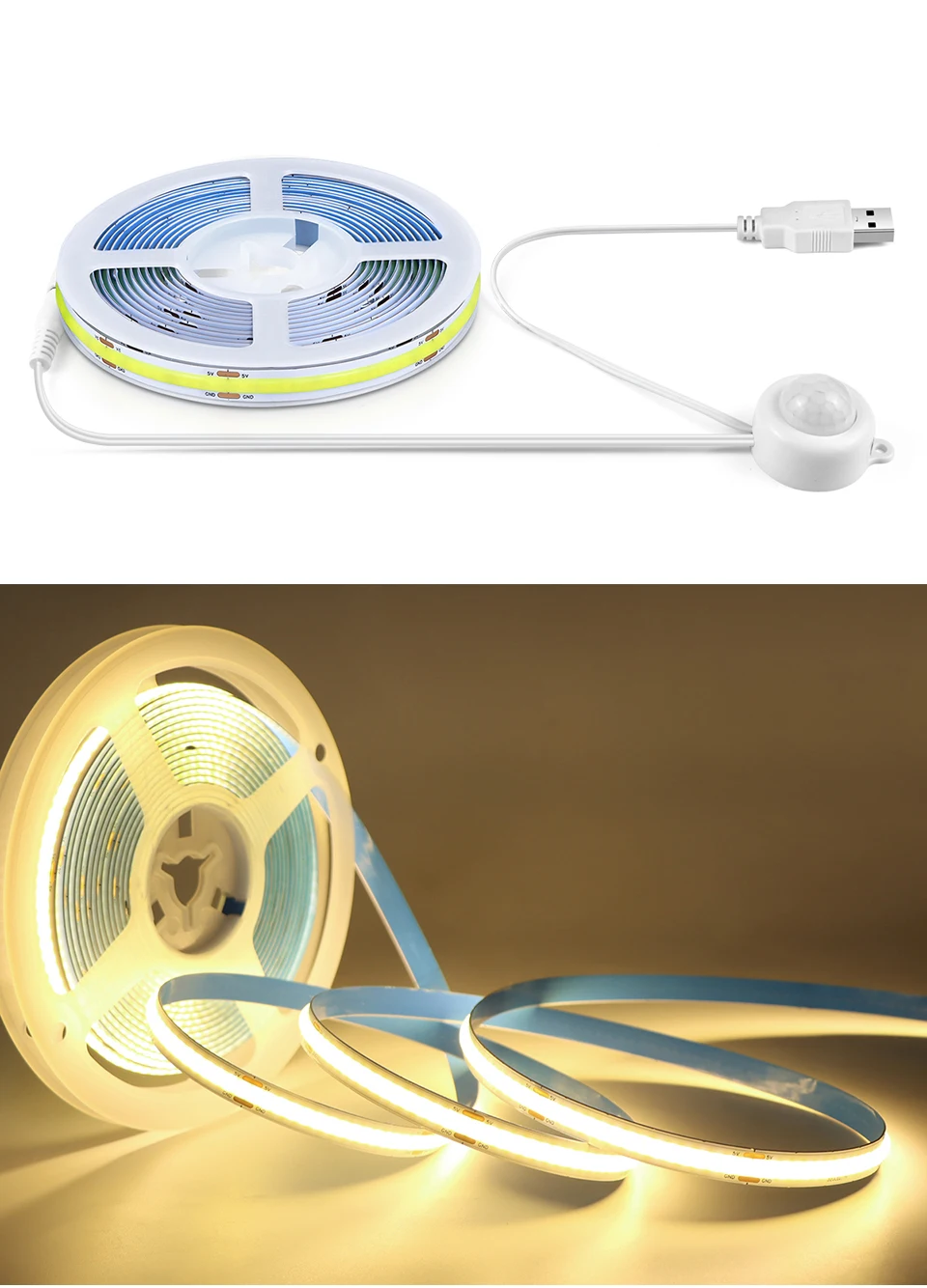 - Tira de luces LED COB con Sensor de movimiento PIR, cinta Flexible con USB, 5V, 320LED/M, para escalera, armario, cocina, luz nocturna, 1M, 2M, 3M, 5M