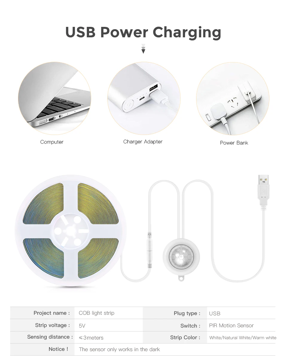 Tira de luces LED COB con Sensor de movimiento PIR, USB, 5V, , 1M, 2M, 3M, 5M